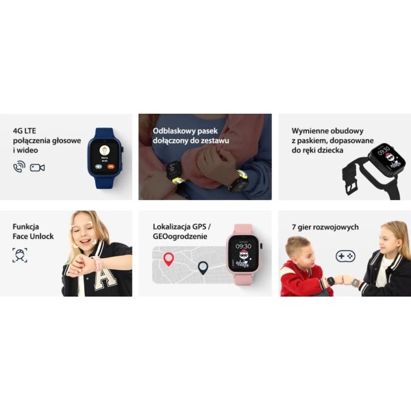 геозона, календар, калькулятор, лічильник кроків, кнопка SOS, вбудована камера, функція FaceUnlock/PIN-блокування, поворотна функціональна кнопка, 7 ігор