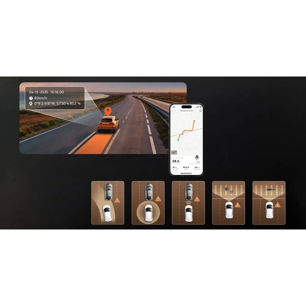 дата, виявлення руху, нічний режим, циклічний запис, G-сенсор, датчик удару, Wi-Fi, автоматичний початок запису після виявлення руху, HDR, система ADAS-FCWS, фотографії з GPS-координатами, режим фотозйомки, голосове керування, мобільний додаток, інформація про поточну швидкість руху, Bluetooth, асистент водія з технологією штучного інтелекту