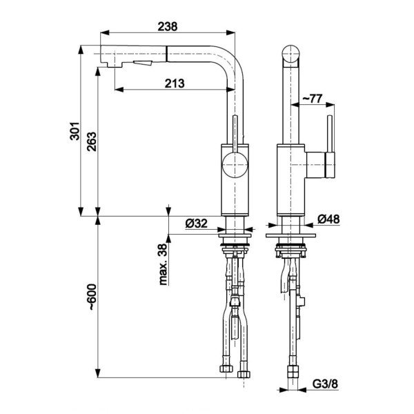 кран високого тиску, перемикач потоку води (стандарт/душ), висувний двоструменевий вилив