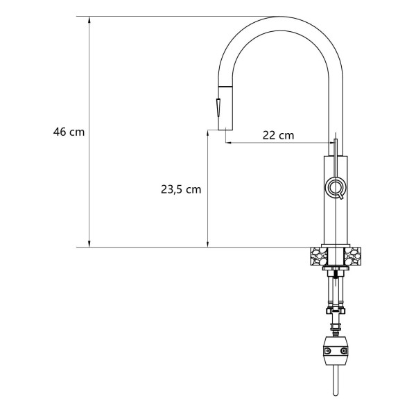 керамічна головка, поворотний вилив, аератор, перемикач потоку води (стандартний/душ), висувний подвійний струмінь