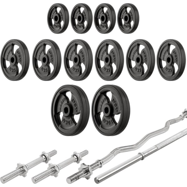 Комплект Marbo Sport MS33_2.0_83KG_G | Двостороння лава + багаторівневі стійки (2 шт.) для штанги зі страховкою + лава Скотта з регульованою опорою + комплект грифів і гумових навантажень 83 кг