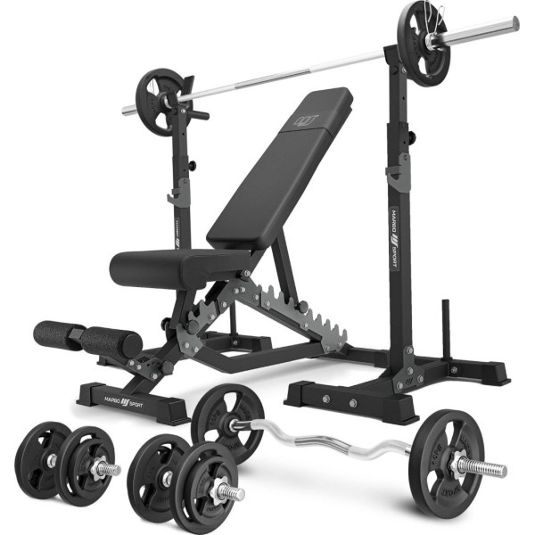 Комплект Marbo Sport MS34_2.0_83KG | Двостороння лава + багаторівневі стійки (2 шт.) для штанги зі страховкою + комплект грифів і навантажень 83 кг