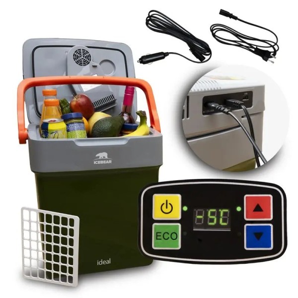 2 режими роботи: максимальне охолодження та режим ECO, велика ручка для перенесення, функція охолодження та обігріву, роз'єм для акумулятора, вертикальне розташування, опція живлення 220-240 В та 12 В