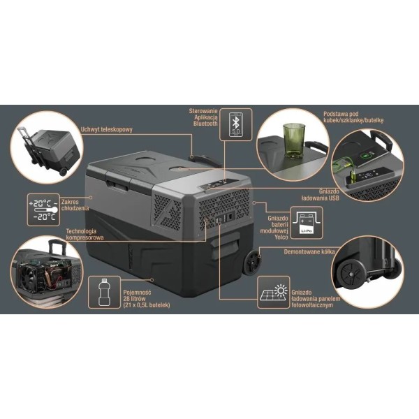 мобільний додаток, Bluetooth, колеса та ручка, місце для 2 чашок на кришці, індикатор температури