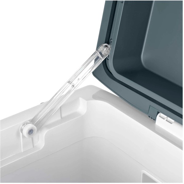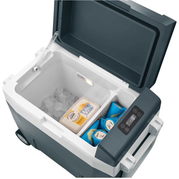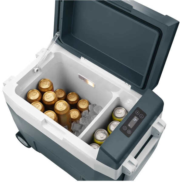 велика ручка для перенесення, дві камери охолодження, функція охолодження та нагрівання, гніздо для батареї, колеса та ручка, можна розмістити вертикально, живлення 220-240 В та 12 В, панель керування з індикатором температури, світловий індикатор режиму роботи, термостат, індикатор температури