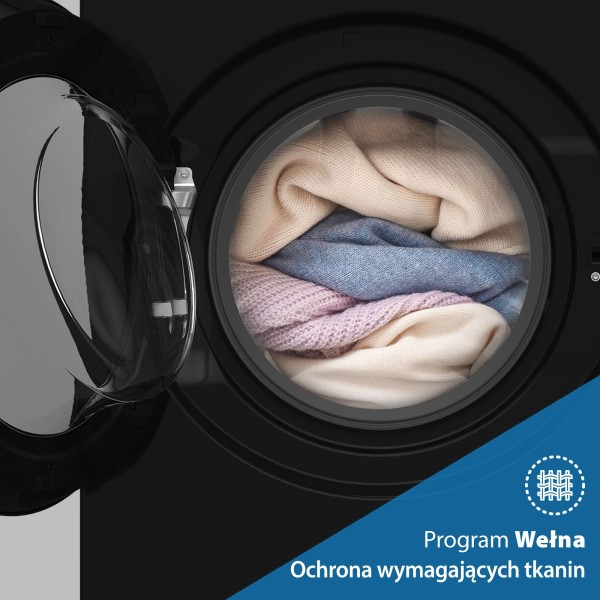 меню польською мовою, високотехнологічний нікельований нагрівач, панель керування з описом, звукове підтвердження вибраної функції, система захисту від дисбалансу