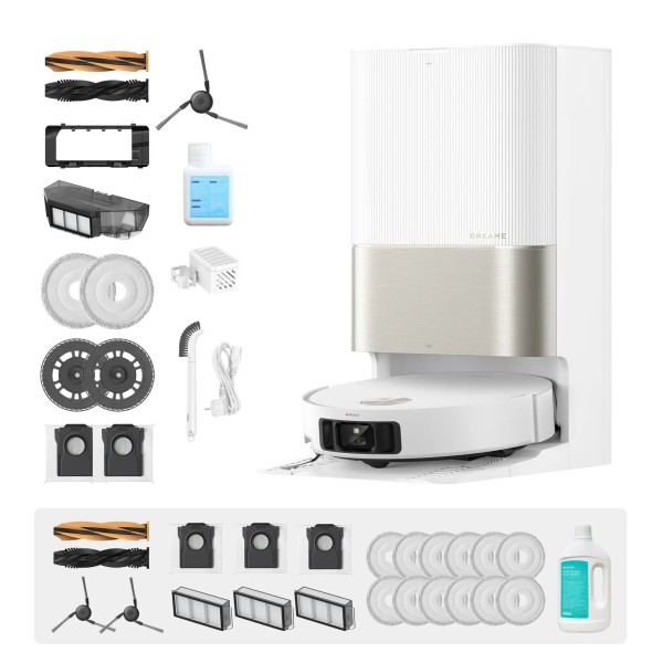 14 подушечок для миття посуду, 2 тримачі для подушечок, 3 фільтри, 5 мішків, інгібітор вапняного нальоту, інструмент для чищення, чохол для щітки, засіб для миття підлоги, контейнер для пилу, шнур живлення, станція самоочищення