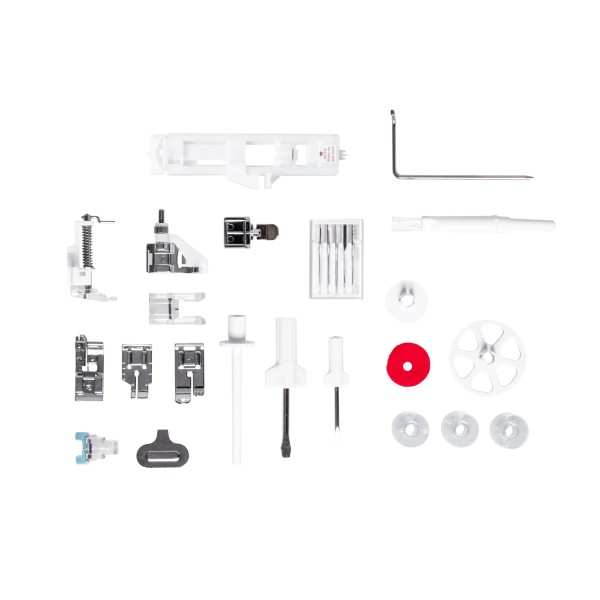2 викрутки, шпульний замок, другий штифт, повстяна шпуля, посібник користувача польською мовою, гарантійний талон, гайковий ключ, набір голок, ковпачок котушки, петелька, педаль, пензлик, чохол, направляюча для квілтингу, ножний стартер, лапка для штопання, лапка для вишивання, лапка для підшивання, лапка для петель, лапка для стьобання, лапка для пришивання ґудзиків, лапка для потайного стібка, лапка для гладдю, лапка для блискавок, універсальна лапка, шпульки