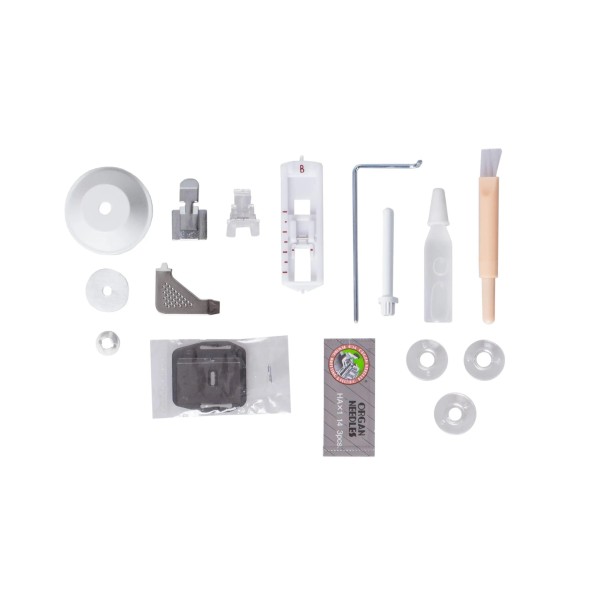 3 шпульки, другий штифт, повстяна шпуля, посібник користувача польською мовою, гарантійний талон, набір голок, маслянка, ножна педаль, кришка, фреза, лапка для петель, лапка для пришивання ґудзиків, лапка для пришивання блискавки, лапка загального призначення, тримачі шпулі, викрутка , набір для вишивання