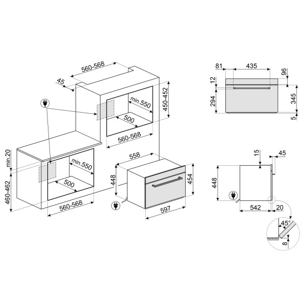 гриль, гриль + мікрохвилі, гриль + вентилятор, швидкий нагрів, конвекція, конвекція + нижній нагрівач, конвекція + нижній нагрівач + мікрохвилі, конвекція + мікрохвилі