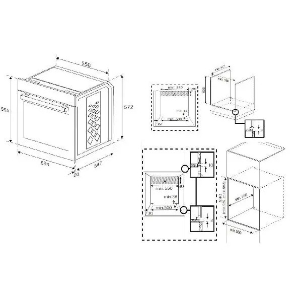 таймер, термостат, сигнал закінчення випічки, електронний контроль температури, індикація тривалості програми, вентилятор, багаторівневе випікання, знімні дверцята, легке знімання скла, електронний сенсорний програматор