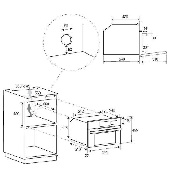таймер, плавне закривання дверцят, електронне регулювання температури, електронний контроль температури, вентилятор, багаторівневе випікання, відображення часу приготування та поточної програми, електронний сенсорний програматор