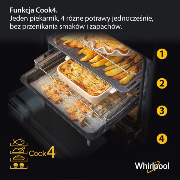 випічка на парі Whirlpool SteamSense, автоматичний вибір параметрів Whirlpool «Шосте почуття», випікання до 4 страв одночасно Whirlpool Cook4, економія часу та енергії Whirlpool Ready2Cook