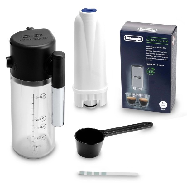 мірна чашка для меленої кави, інструкція користувача польською мовою, гарантійний талон, спінювач молока, фільтр для води, кабель живлення