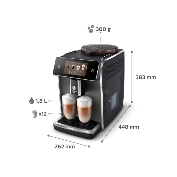 автоматичне парове очищення молочних контурів за допомогою технології HygieSteam, спінювання молока Saeco LattePerfetto, запрограмовані профілі смаку Saeco CoffeeMaestro