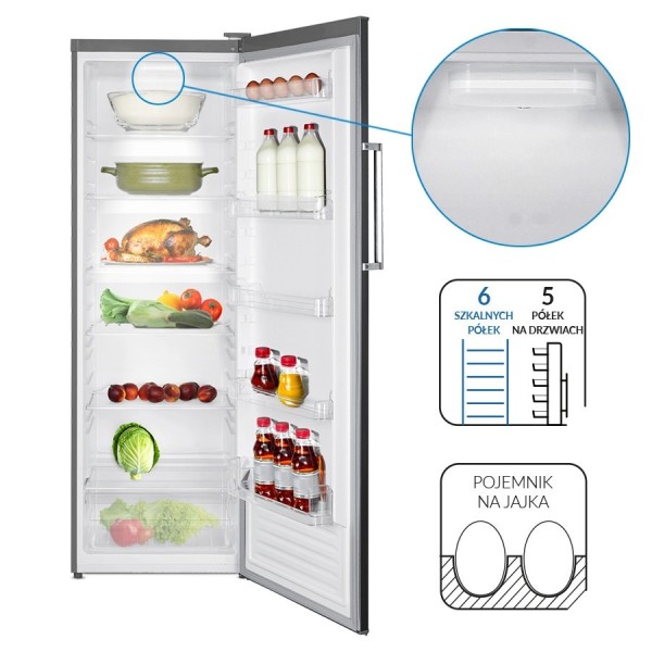 6 скляних полиць, 5 полиць на дверцятах, 1 шухляда, лоток для яєць