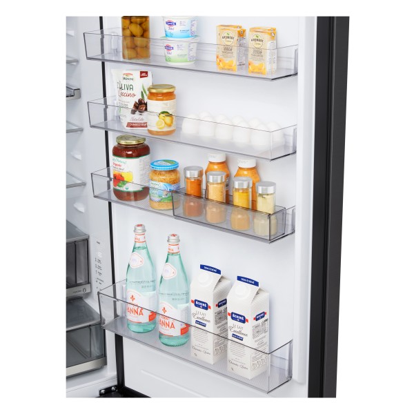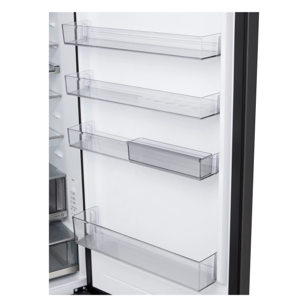 4 скляні полиці, 1 полиця для пляшок, 4 полиці на дверцятах, 1 шухляда для свіжості, 1 шухляда з незалежним контролем вологості
