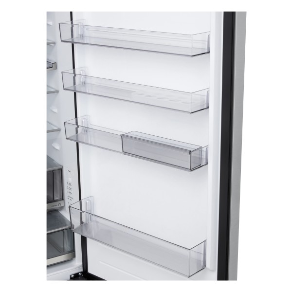 4 скляні полиці, 1 полиця для пляшок, 4 полиці на дверцятах, 1 шухляда для свіжості, 1 шухляда з незалежним контролем вологості