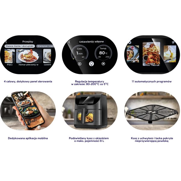 нековзні ніжки, мобільний додаток, автоматичне вимкнення, опції смаження, гриля та випікання, оглядове віконце, внутрішнє підсвічування, рецепти в додатку, сигнал завершення роботи, таймер, Wi-Fi, індикатор живлення, РК-дисплей