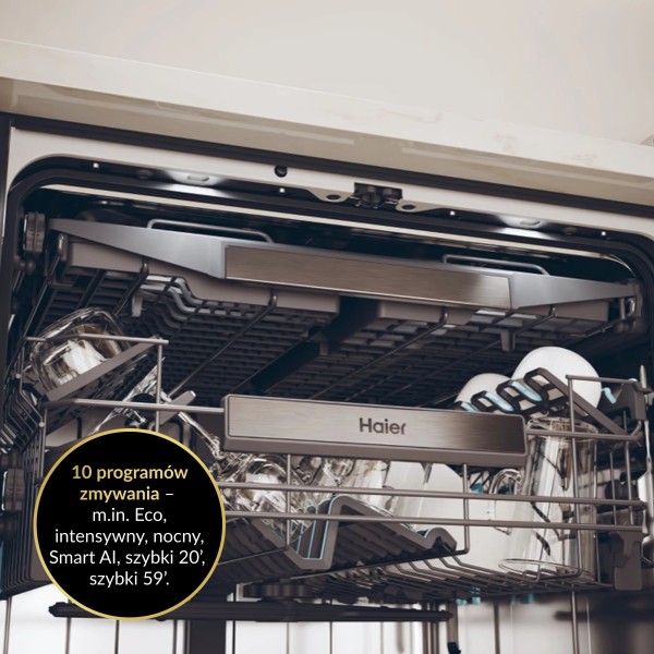 інверторний двигун, додаток Haier hOn, ефективний мийний важіль Haier H-Spray, індикатор роботи Haier PartLight, дисплей Haier DotMatrix, третій мийний важіль Haier PowerWash, захист скла Haier Crystal Protect, регулювання висоти верхнього кошика Haier Easy-Click, система сушіння Haier Dry Ящик для столових приборів Boost, Haier Shine Plus