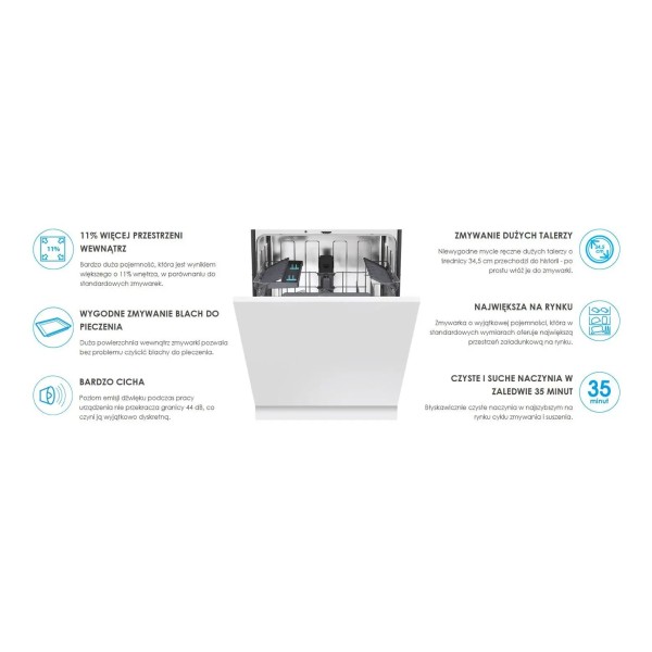 автоматичне відкривання дверей, меню польською мовою, датчик забруднення води, текстовий дисплей, можливість підключення до гарячої води, регулювання висоти задніх ніжок спереду, сенсорна панель управління, підключення Wi-Fi, розсувні петлі