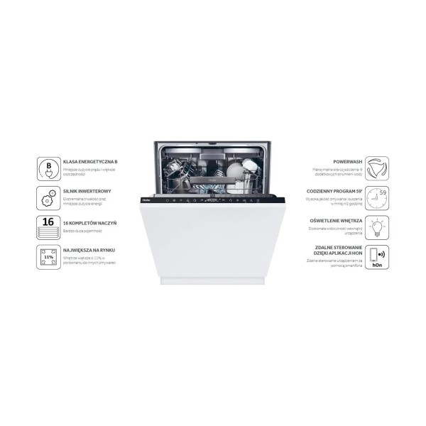 антибактеріальний фільтр, світлодіодний індикатор закінчення роботи, автоматичне відкривання дверей, меню польською мовою, текстовий дисплей, можливість підключення до гарячої води, регулювання висоти задніх ніжок спереду, сенсорна панель управління, система самоочищення фільтрів, Wi-Fi Підключення Fi, петлі з подвійним нахилом