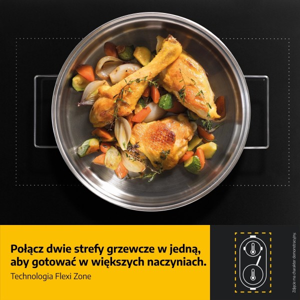 18 рівнів потужності нагріву, 4 зони "Booster", 4 автоматичні програми, автоматичний нагрів, автоматичне вимкнення, автоматичне приготування, датчики температури, гасіння, швидке кип'ятіння, функція підтримки тепла, функція FlexiCook - об'єднання двох зон в одну більшу, функція приготування на низькій потужності, функція паузи, функція PowerManagement, приготування на низькій температурі (повільний вогонь), таймери окремих зон приготування, легке встановлення EasyFit, врівень з поверхнею, можливість програмування часу приготування, окреме керування кожною зоною, плавне регулювання потужності нагріву, підтримка тепла, розтоплення, звуковий сигнал закінчення роботи, система автоматичного кипіння, технологія "Шосте чуття", таймер, РК-дисплей, відображення встановленої потужності нагріву