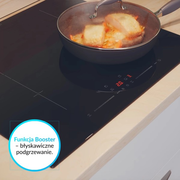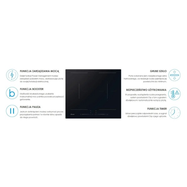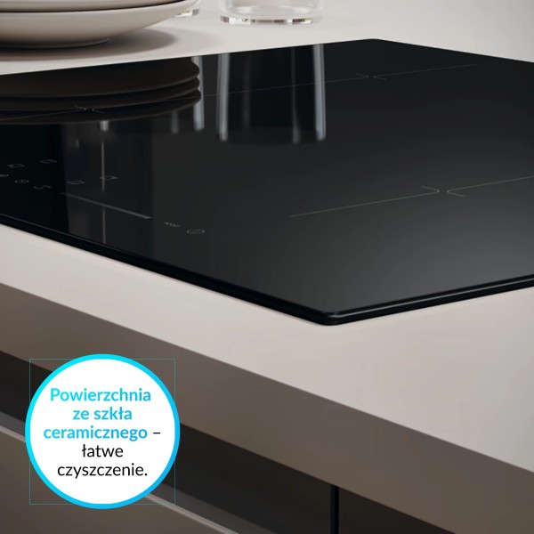 4 поля "Booster", 9 рівнів потужності нагріву, акустичне підтвердження обраної функції, функція Booster, функція Bridge - об'єднання двох полів в одне велике, функція powerManagement, можливість установки врівень з кам'яною або композитною стільницею, можливість програмування час приготування, поля Booster, датчик управління, таймер, індикатор залишкового тепла, дисплей встановленої потужності нагріву